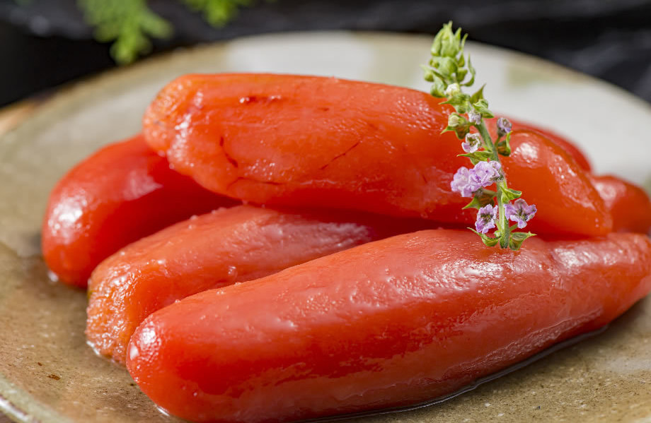 取り出した卵の中から「真子」と呼ばれる完熟卵を厳選し、新鮮なうちに生のまま低塩のオリジナル調味液に一昼夜漬込み、さらに低温下でじっくりと熟成させて旨みを引き出すように仕上げています。