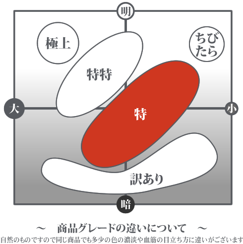 炊きたてのご飯にのせてたらこ本来の味を楽しみたい時やご年配の少人数のご家庭へのご贈答には「極上」を、パスタ等の料理にたっぷり混ぜて使う時やお子様がいらっしゃるご家庭にはたくさん食べてもらえるように「特」というように、目的に応じて使い分けをされるお客様も多くいらっしゃいます。